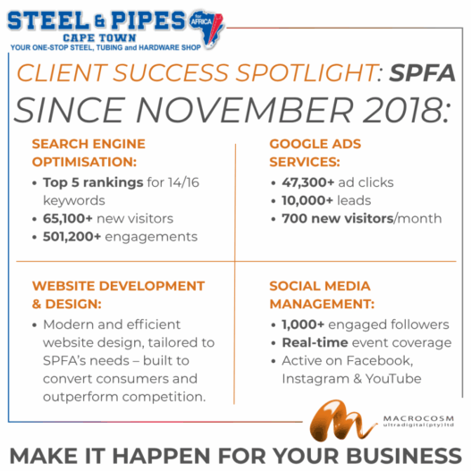 At Macrocosm Ultra Digital, we pride ourselves on delivering measurable results that elevate our clients’ digital presence. One standout example is our long-standing partnership with Steel & Pipes For Africa (SPFA)—a trusted name in the South African steel and hardware industry.